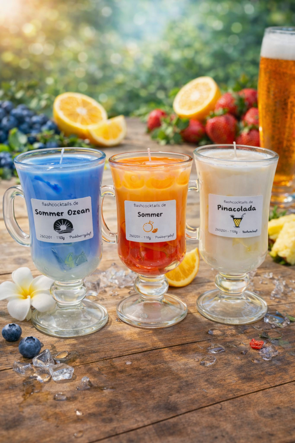 Unsere handgegossenen Duftkerzen im stilvollen Cocktail- bzw. Latteglas bringen Sommerfeeling direkt in dein Zuhause.